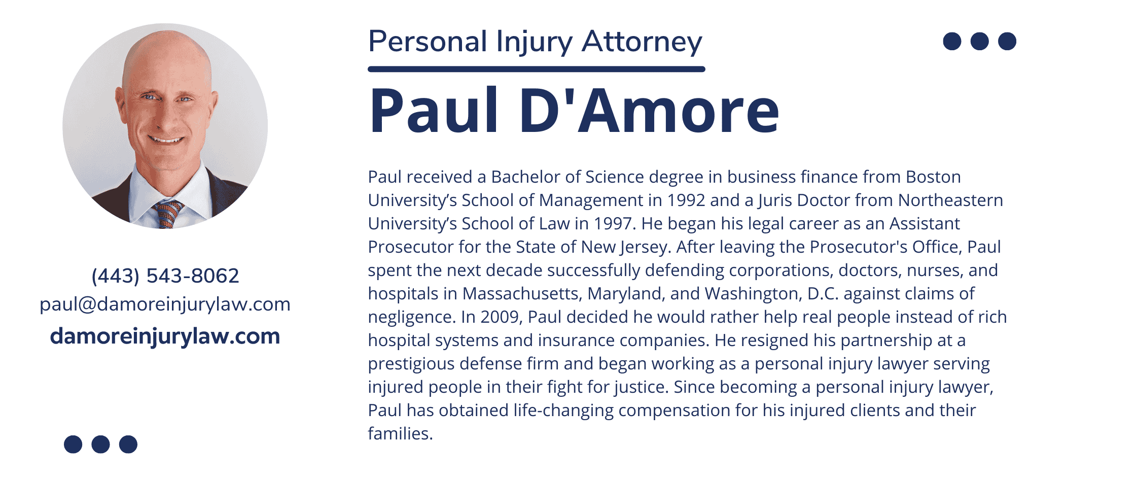After almost 20 years of successful practice, Paul D’Amore founded D’Amore Personal Injury Law to focus on the real-life needs of people who have been catastrophically injured in medical malpractice, birth injury, and major accident cases. The firm has successfully represented injured parties against every major hospital in the Baltimore, MD, and Washington, D.C. areas, achieving successful outcomes and obtaining life-changing compensation for their clients.