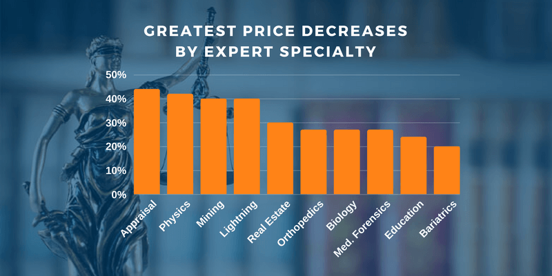 The expert specialty areas that saw the greatest expert witness fee decrease in 2017 saw a 32.1% drop. The top 10 specialties with the greatest fee decrease in 2017 are Physics, Orthopedics, Appraisal, Mining, Lightning, Biology, Medical Forensics, Bariatrics, Real Estate/Residential, and Education. Appraisal expert witnesses saw the greatest total percentage change in expert witness fees at a 44% decrease. Physics expert witnesses saw a 42% fee decrease. Mining expert witnesses saw a 40% drop in fees.