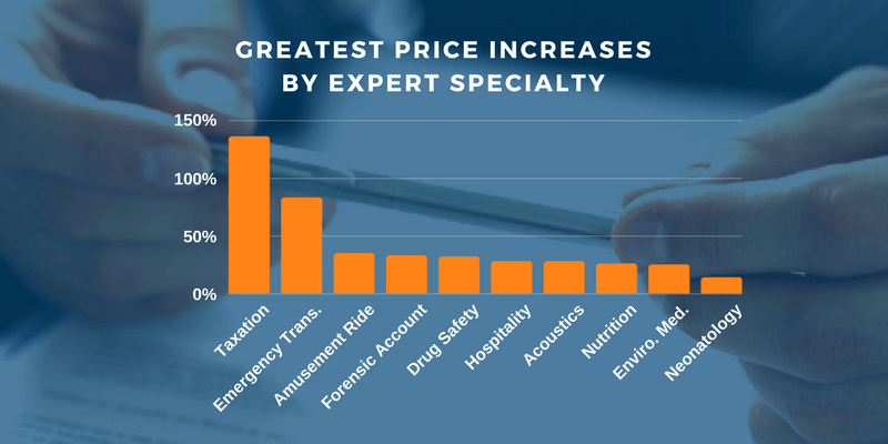 Last year, a range of specialties across disciplines experienced a significant increase in average total price for expert witness services. The top 10 expert witness specialties that saw the greatest fee increase in 2017 are Taxation, Emergency Transportation, Drug Safety, Occupational & Environmental Medicine, Forensic Accounting, Amusement Rides, Hotels and Hospitality, Nutrition, Acoustics, and Neonatology. Taxation expert witnesses saw a staggering 136% fee increase. Emergency Transportation expert witnesses saw an 83% increase in fees and Amusement Ride expert witnesses saw a 35% increase in fees.