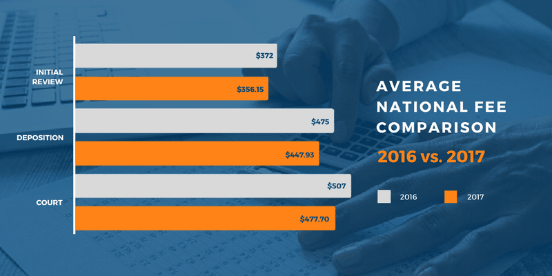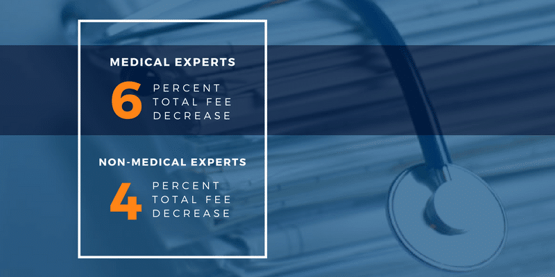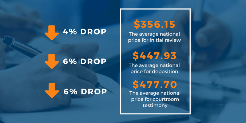 National Fee Changes: Expert fees across the board have decreased. The average national price for initial case review fell by 4%, deposition appearances by 6%, and courtroom testimony by 6%.