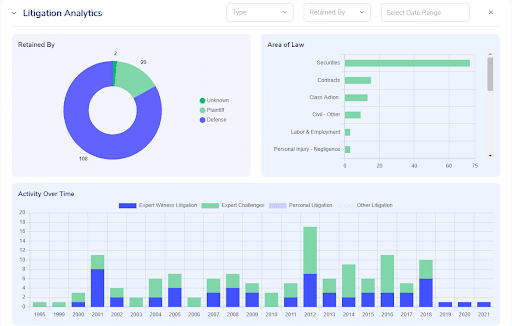 Take a deep dive into any expert’s litigation activity, quickly explore critical data, and pinpoint vulnerabilities in an adversary’s credibility, qualifications, or methodology with Litigation Analytics.